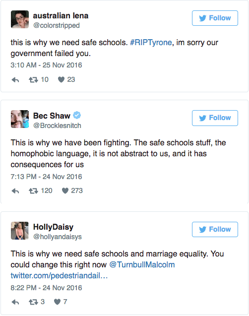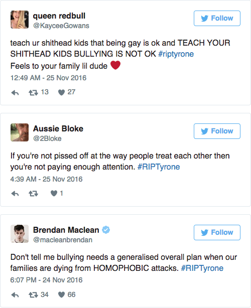 Brisbane year seven student Tyrone Unsworth died on Monday after he allegedly suffered years of homophobic bullying by other children.