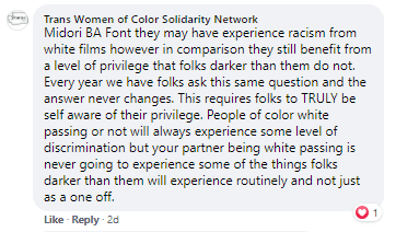 White allies and accomplices are welcome to attend, but will be charged a $10 to $50 reparations fee (and given a wrist band as proof of payment) that will be used to keep this event free of cost for BLACK AND BROWN Trans and Queer COMMUNITY but to also ensure that performers can be paid well. **** – facebook statement Trans Women of Color Solidarity Network