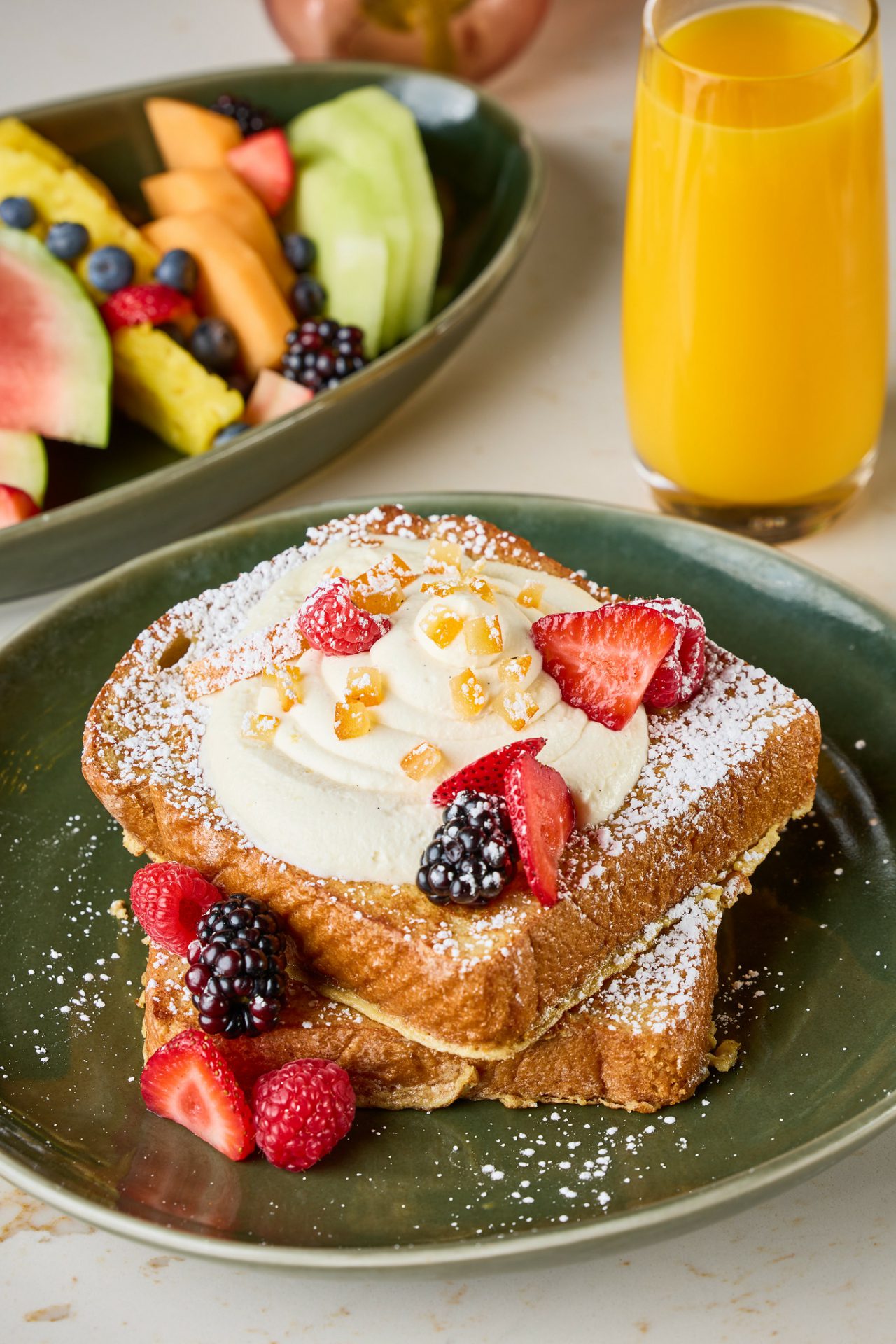If you ask me, one of the top items is the Grand Marnier French Toast which is made with brioche and topped with fresh berries, Grand Marnier whipped mascarpone, and candied orange.