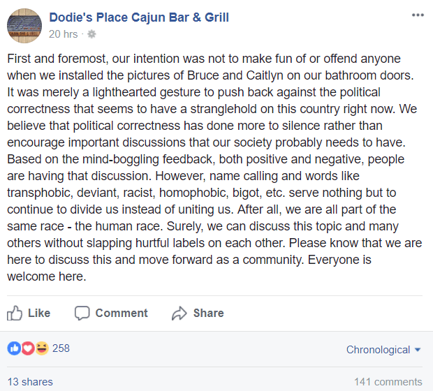 In that response, Dodie’s calls the doors “a lighthearted gesture to push back against the political correctness that seems to have a stranglehold on this country right now.”