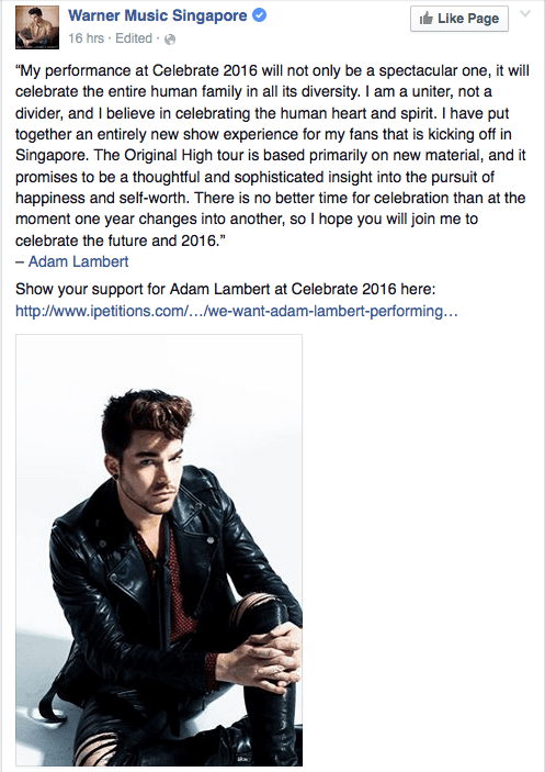 A petition demanding for the singer to be dropped from the event has been signed by over 15,000 Singaporeans due to fears that the openly gay singer will perform “lewd acts” on stage in front of children. The petition also expressed concern over Lambert’s role as an LGBT activist, saying he engages in the “active promotion of a highly sexualized lifestyle and LGBT rights, both of which are contrary to mainstream Singaporean values.”