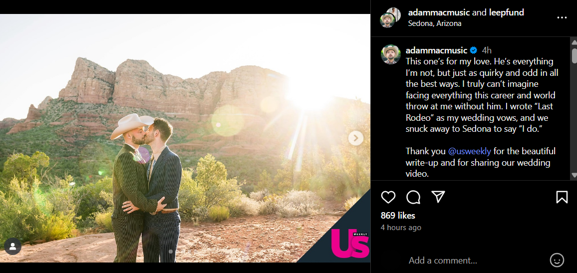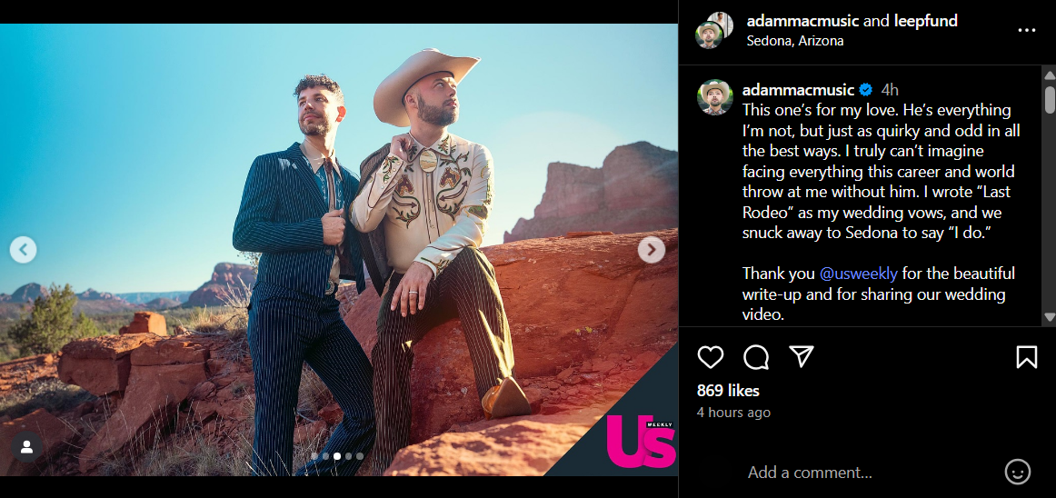 If you didn’t believe in love at first sight, you will now. The music video for Last Rodeo features clips from the couple’s stunning wedding day. There’s something almost magical about seeing them exchange vows, surrounded by the grandeur of the Sedona landscape, their love as unshakable as the red rock formations behind them. Adam’s tribute to Lee was clear: “This one’s for my love,” he wrote on Instagram, sharing their special day. “He’s everything I’m not, but just as quirky and odd in all the best ways.” Can we get a collective “aw”?