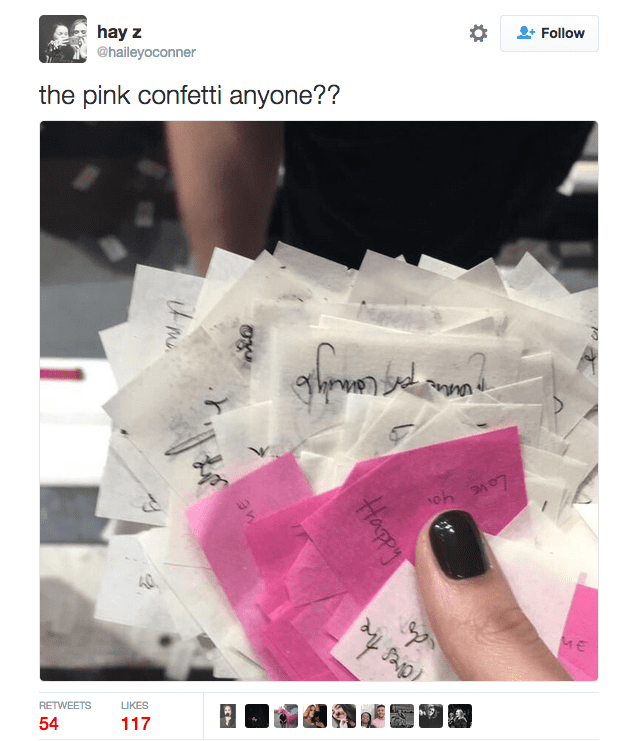 "we got pink confetti tonight.. this confetti is normally white" i'm crying