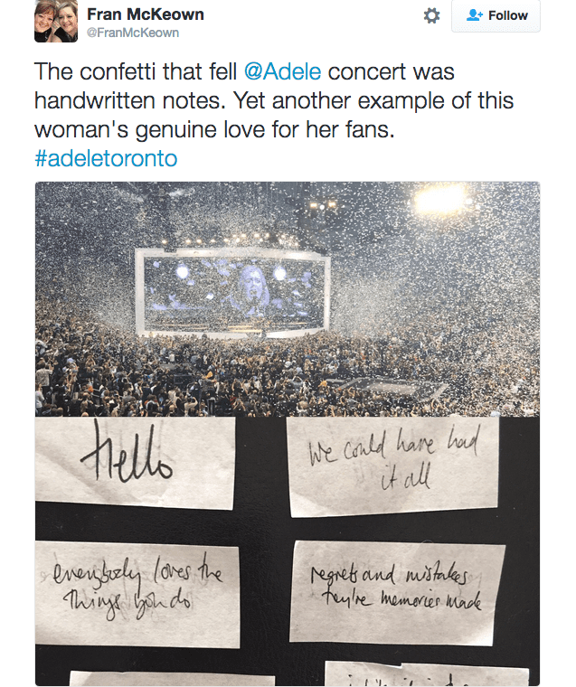 At Adele's recent concerts, she's been showering fans with white confetti that features song lyrics on every scrap of paper, but on this particular evening, the British songstress' longtime partner, Simon Konecki, decided to replace some of the white confetti with pink confetti, and the song lyrics with love notes.