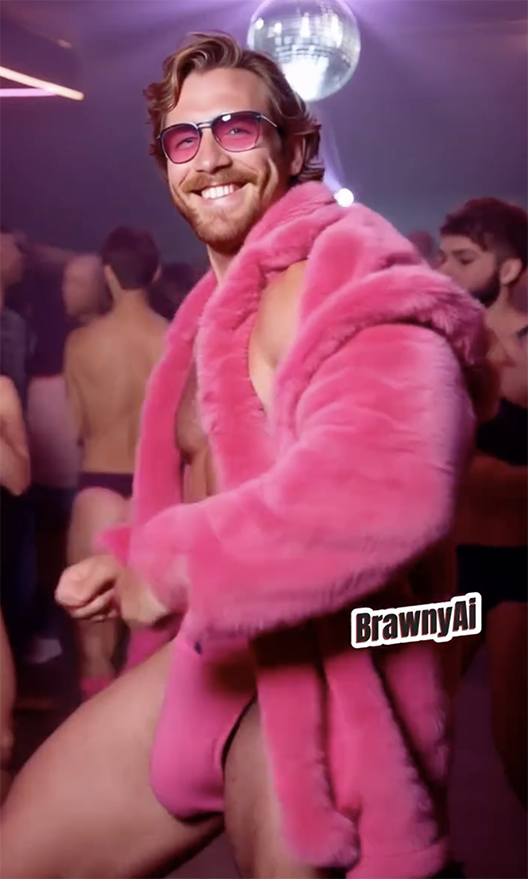 These AI creators are digital sex sorcerers and in some cases their identity is unknown. Take for example the creator of BrawnyAI who goes live on IG often, but incognito and masked, to talk about how he crafts each drool-worthy detail of his digital dudes, from the glisten on a pec to the teasing half-chub bulge peeking through a tight over-stuffed Speedo. And that’s just the beginning as his IG account quickly approaches 200,000 followers.