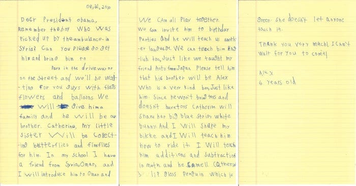 Alex is six years old. After seeing a distressing photo of a young boy in Syria, Alex wrote a letter asking President Obama to help bring that boy to America so he could be part of Alex's family. Learn more: www.whitehouse.gov/refugees – youtub.com
