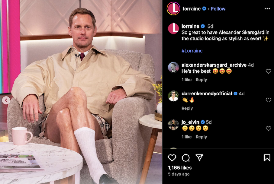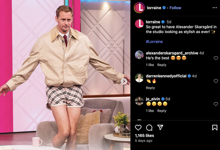 But it was his recent Lorraine guesting that really stole the show. Appearing on the beloved British morning talk show, Skarsgård charmed viewers in a beige jacket, crisp white shirt, and a very proper red tie — only to reveal that the lower half of the outfit featured… yes, thigh-baring tailored shorts. Equal parts respectable and risqué, the whole ensemble was polished off with that signature Skarsgård grin that somehow makes everything he wears feel like the new normal.