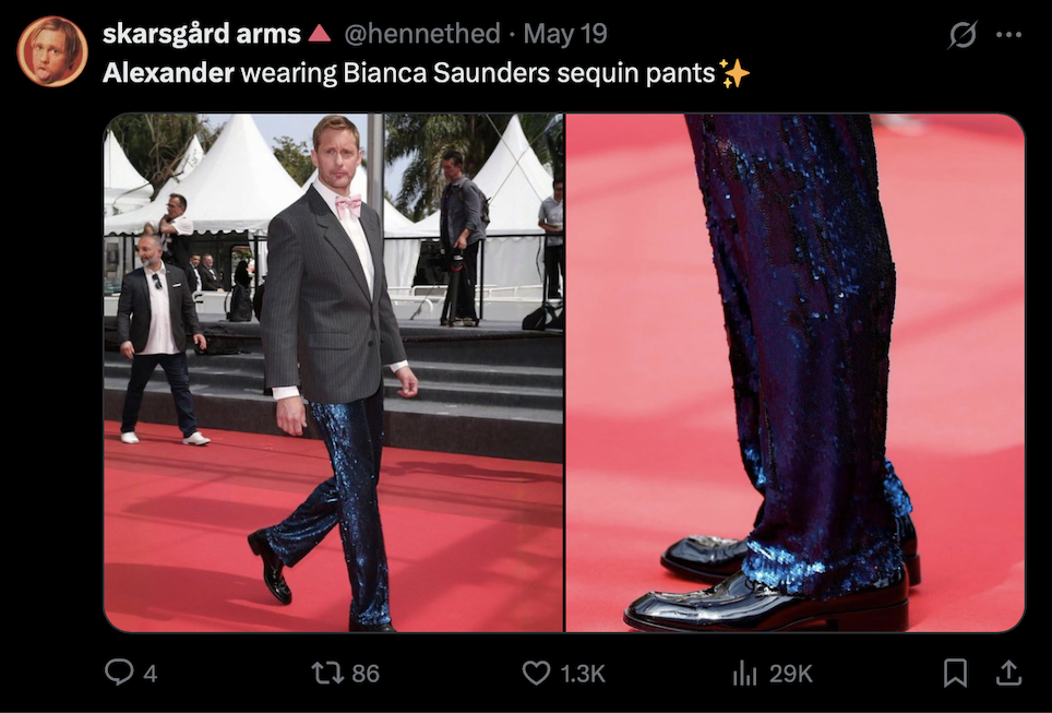 Speaking of leather, Skarsgård is serving style and story while doing the rounds at the Cannes Film Festival. From thigh-high leather boots and sleek leather pants to dazzling blue sequined trousers that twinkle brighter than the Riviera, Skarsgård has been nothing short of a bedazzled fashion icon. The man understood the assignment — and then submitted extra credit.