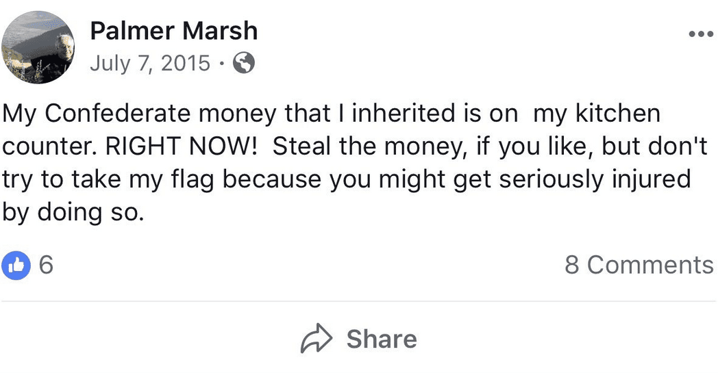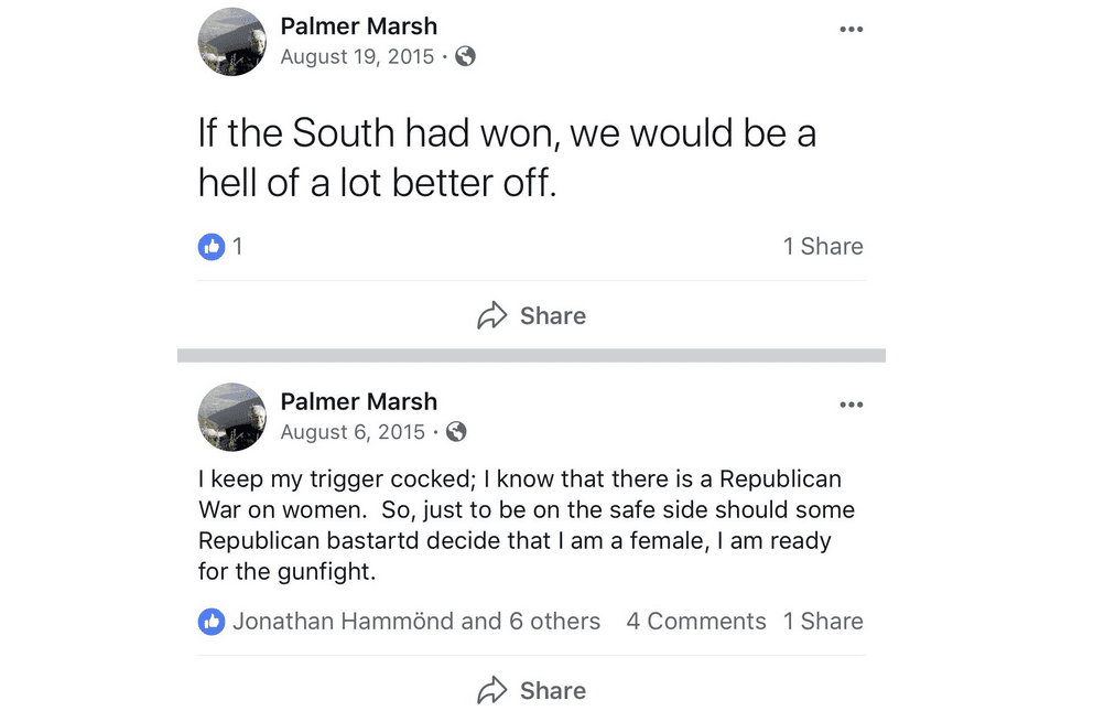 The Georgia Voice uncovered an additional post from Marsh's Facebook account from 2015 that supports the Confederate flag.
