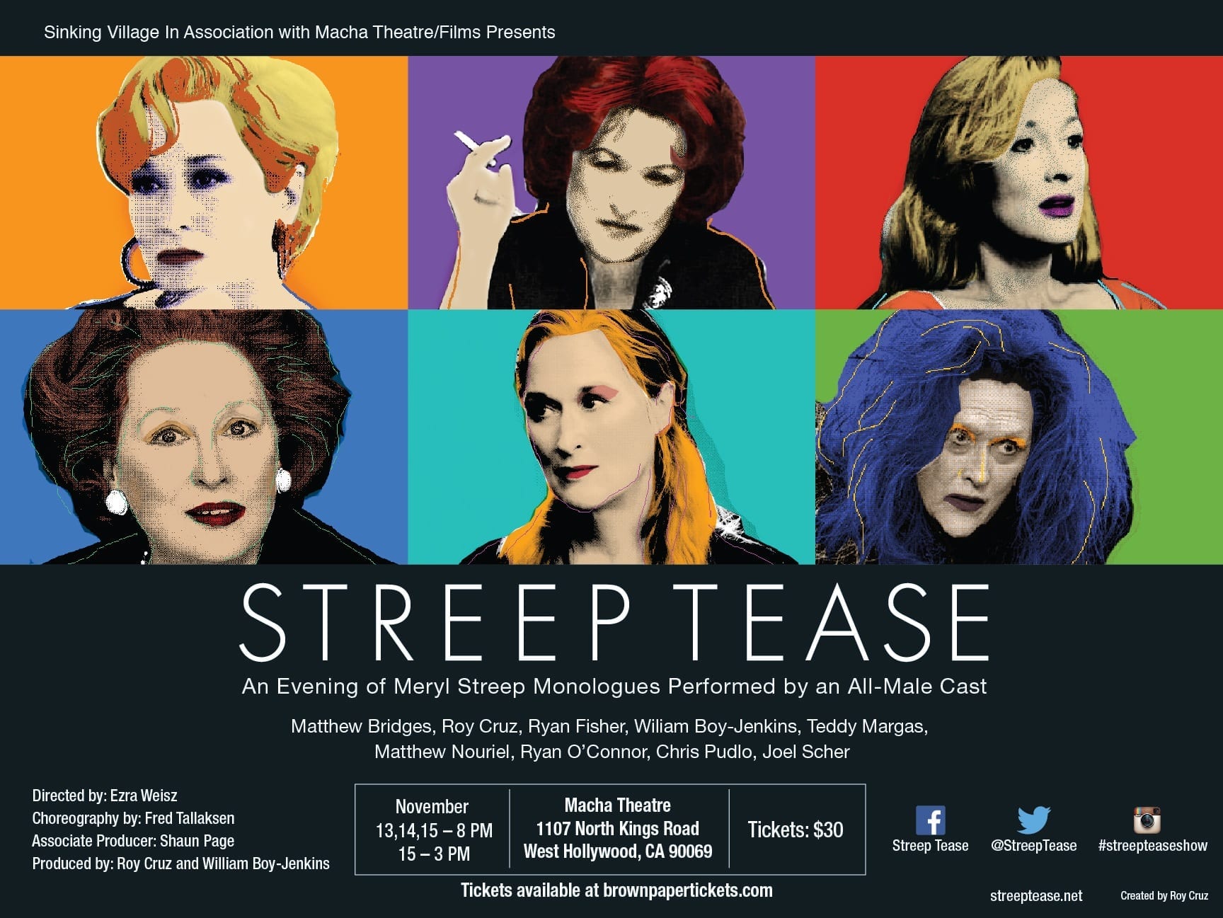 Streep Tease is a show made up of male actors performing their own interpretations of their favorite Meryl Streep characters. We all love Meryl, we all have our favorite scene and there’s no better way to pay tribute to her than to channel La Streep on stage. With a new cast, new characters, more drama, more comedy, we promise to bring you the best and ultimate tribute. So join us in celebrating our inner Streep! – STREEP Tease Press Release.