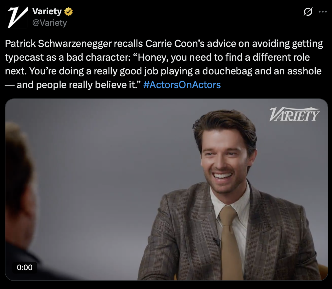 Patrick, who has been building a solid acting résumé for years, opened up about the pressure of breaking out of typecast roles. After playing one too many “bad guys,” actress Carrie Coon gave him some wise (and hilarious) advice: