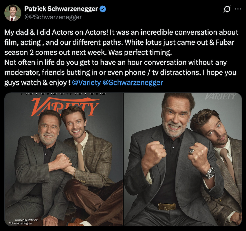 Arnold Schwarzenegger beams with pride over Patrick’s performance in “The White Lotus”: “I was absolutely blown away.” #ActorsOnActors pic.twitter.com/0eO96z5Tfp
