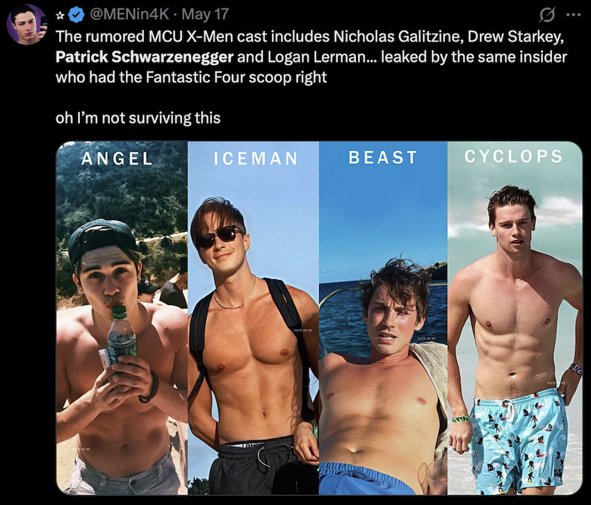 Still, don’t let the typecasting fool you — Patrick’s got serious range. With rumors swirling that he’s in talks to play Cyclops in the next X-Men series and is actively campaigning to lead Luca Guadagnino’s remake of American Psycho, he’s more than ready to show the world he’s more than just a pretty face (and body).