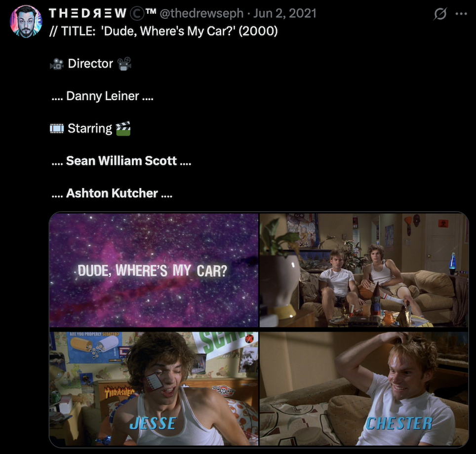 Released in 2000, the film follows Jesse (Kutcher) and Chester (Scott), two blissfully clueless besties who wake up after a wild night only to realize… they’ve misplaced their car. Sounds simple, right? Not quite. What starts as a hungover scavenger hunt quickly spirals into a galaxy-level conspiracy involving UFOs, cults, gender-bending aliens, and of course, the iconic “And then?!” drive-thru scene. It’s dumb, it’s chaotic, and somehow, it’s also kind of endearing.