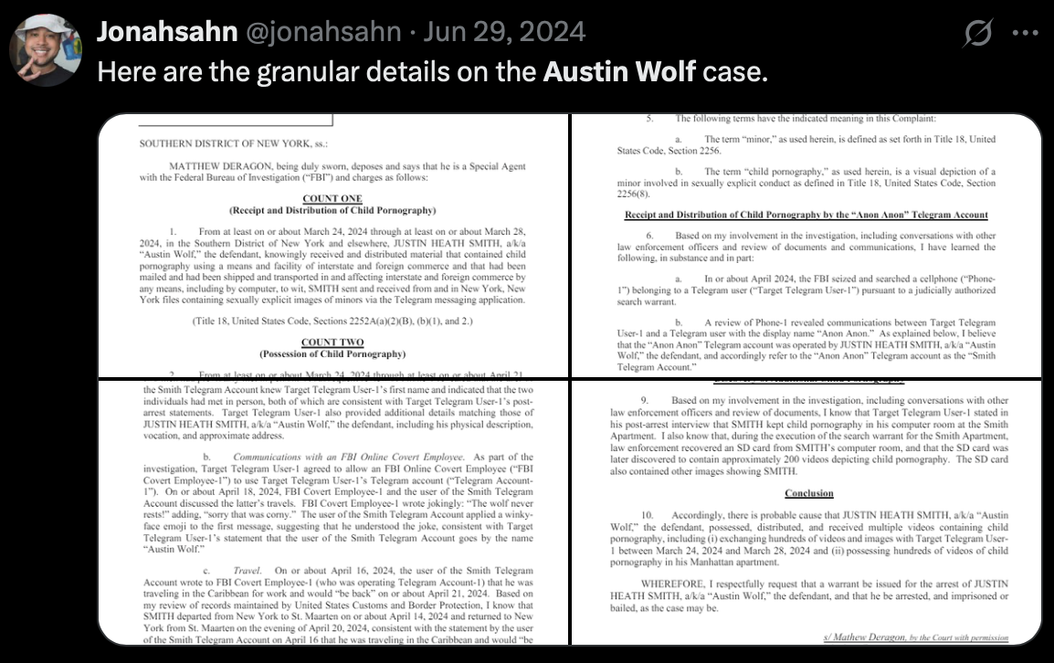 Following the seizure, an undercover FBI agent engaged in a series of online conversations with Smith, during which he reportedly revealed personal details confirming his identity. On April 21, 2024, FBI agents executed a search warrant at Smith’s Manhattan apartment. There, they reportedly discovered an SD card with hundreds of files, including graphic material involving children — some as young as infants. One particularly disturbing video reportedly depicted a 10-year-old child bound and raped.