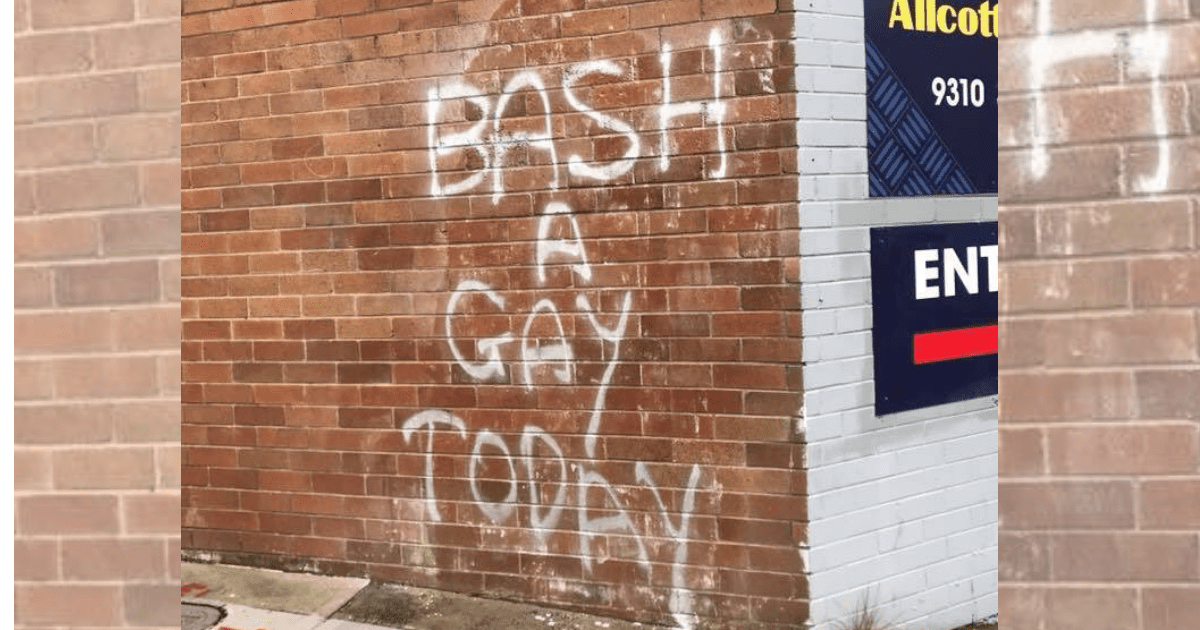 Last week residents from a neighborhood in Sydney were receiving homophobic letters from Jesus blaming LGBTQIA people for the drought and recent hail storm. Now this week another suburb of Sydney is seeing some more hate with the recent appearance of homophobic graffiti. According to news.com.au two witnesses, Laura Hunter and April Long, encountered an older man spray painting a wall with the words “BASH A GAY TODAY”.