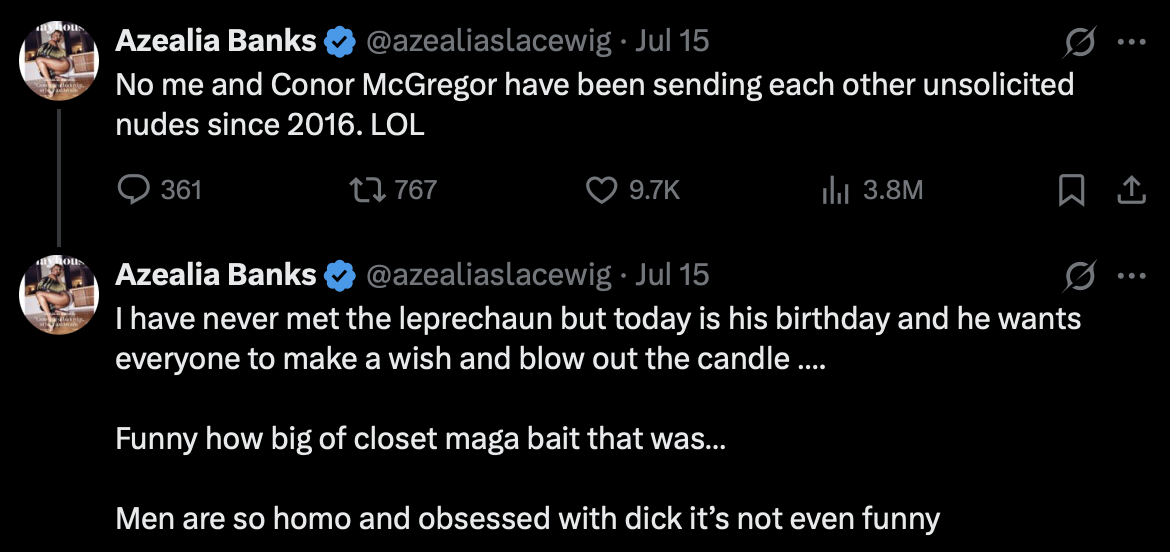 Rapper/singer and perennial troublemaker Azealia Banks made headlines on July 15 after publicly accusing MMA fighter Conor McGregor of sending her “unsolicited nudes.” The controversial artist took to X (formerly Twitter) to share her claims, igniting a wave of social media reaction.