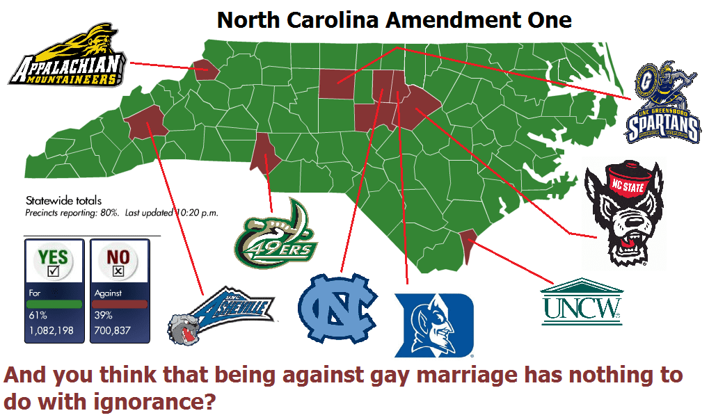 What happened UNC? Did you lose something called integrity? Are you not a beacon of intelligence in a state that has a recent history of needing beacons? In 2012, the red counties of NC were the only ones in the state to vote down Senate Bill 514 is: "An Act to Amend the Constitution to Provide That Marriage Between One Man and One Woman is the Only Domestic Legal Union That Shall Be Valid or Recognized in This State." As you can see in the map, the only states to vote down the amendment were ones that contained a college or university.