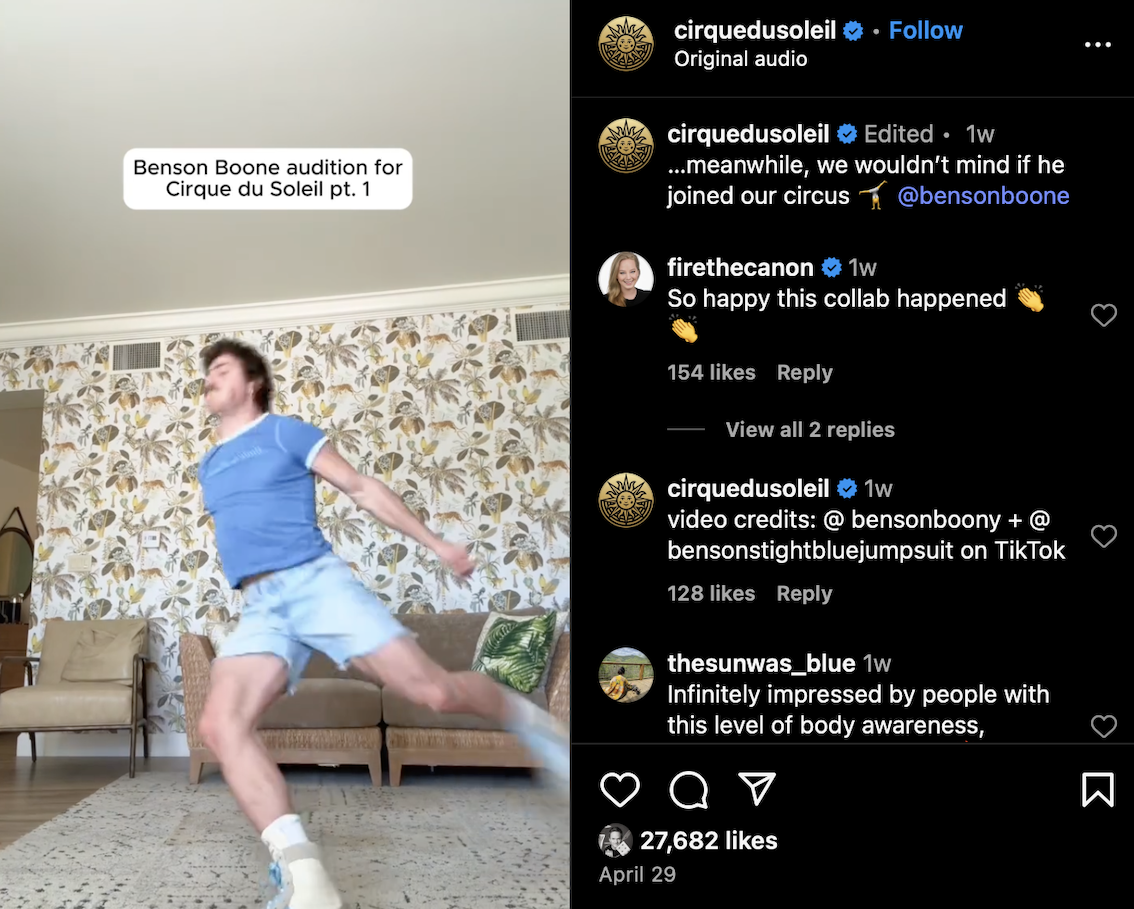 Apparently, Cirque du Soleil got the memo too. The iconic acrobatic troupe just posted a series of videos featuring the Coachella-blessed crooner flipping, tumbling, and generally defying gravity in what appears to be a regular hotel room. The video is cheekily titled “Benson Boone audition for Cirque du Soleil Pt. 1 and 2”, and if you’re wondering, yes, it’s exactly as chaotic and delightful as it sounds.