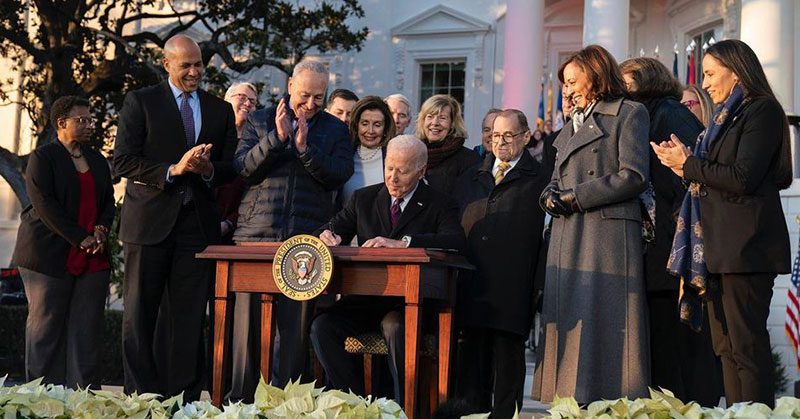 Before signing the act into law, Biden gave a shoutout to the lawmakers who made the legislation happen, including Sens. Tammy Baldwin, Susan Collins, Chuck Schumer, Dianne Feinstein, and out U.S. Reps. David Cicilline and Sharice Davids as well as LGBTQ allies U.S. Rep. Jerrold Nadler and House Speaker Nancy Pelosi.