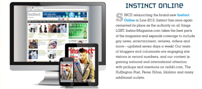 Our site has become the heart of Instinct Magazine, a brand that represents one of the largest destinations where the LGBT community receives its news and entertainment.