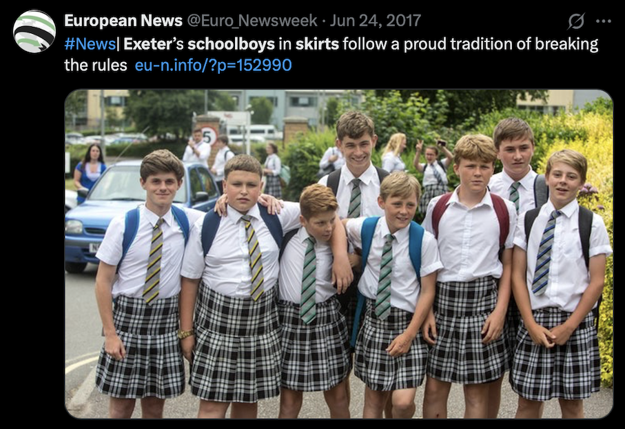 Back in the summer of 2017, the classrooms at Isca Academy in Exeter, Southwest England, were sweltering under record-breaking heat. Temperatures soared to levels not seen since the 1970s. For most students, relief was found in lighter clothing—except for the boys, who were bound by a rigid school uniform policy that forbade shorts. But instead of simply sweating through the heat, a group of male students decided to take matters—and hemlines—into their own hands, by wearing skirts.