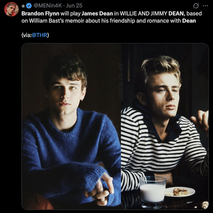 The movie is adapted from William Bast’s memoir Surviving James Dean, chronicling the legendary actor’s intimate and complicated relationship with Bast himself, who is widely believed to have been one of Dean’s great loves. The film is already turning heads, and honestly, Flynn couldn’t be a more fitting choice—he’s got the jawline, the soulfulness, and apparently, the camera-melting charisma to pull it off.