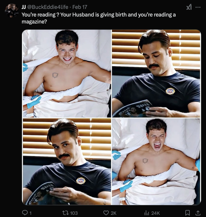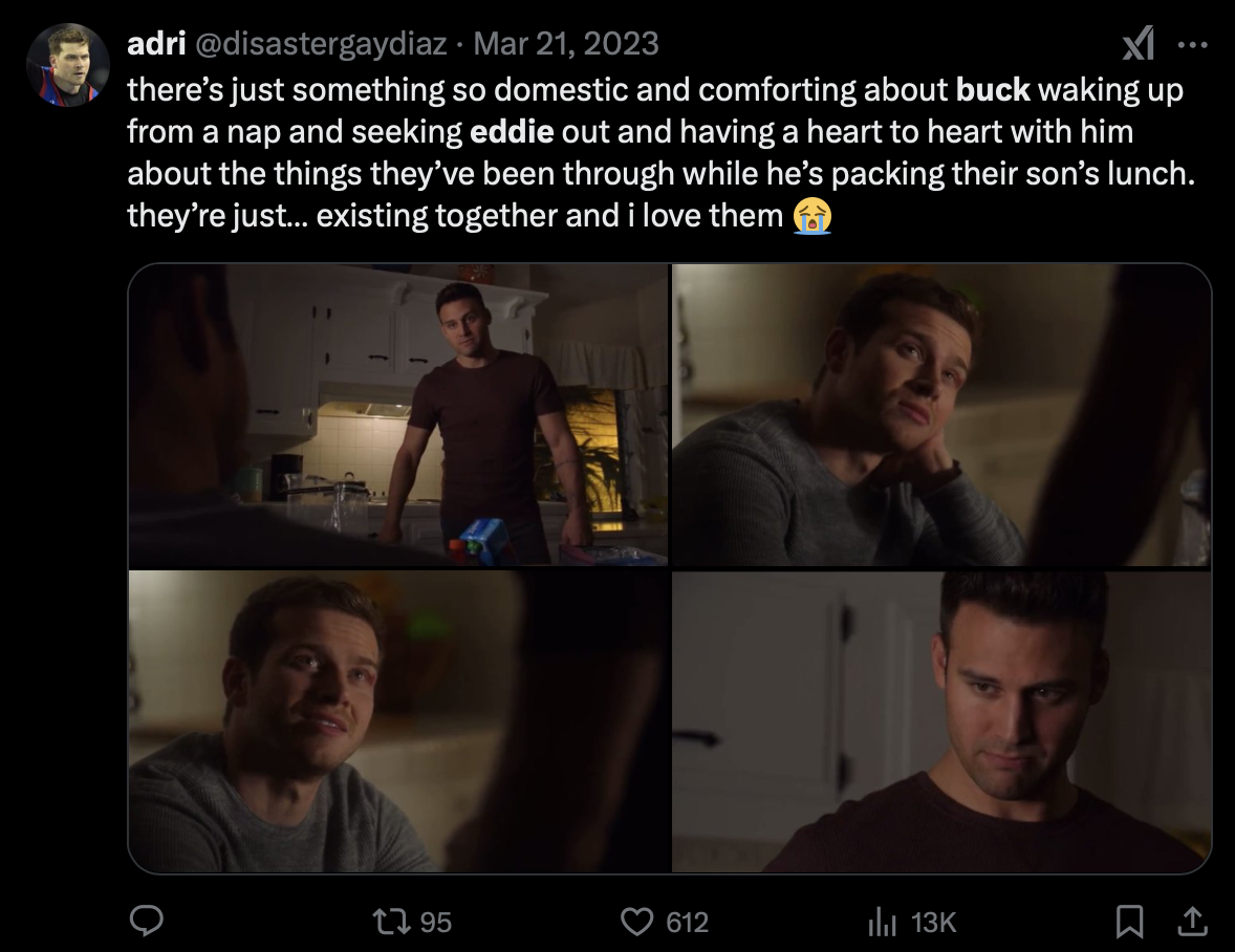 just a reminder that canonically eddie has shown more jealous behaviour towards buck’s partners than buck has towards any of eddie’s girlfriends pic.twitter.com/roXqKs7QMg