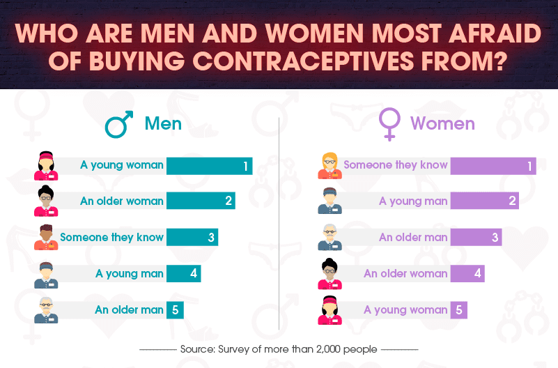 - Men are most afraid of buying contraceptives from a young woman. Women on the other hand, fear buying them most from someone they know.