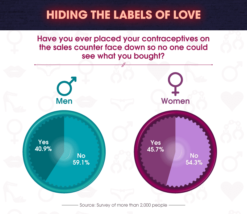 - 80% of women feel "awkward," "embarrassed," or "anxious/nervous" about buying condoms and other contraception compared to 72% of men agree.