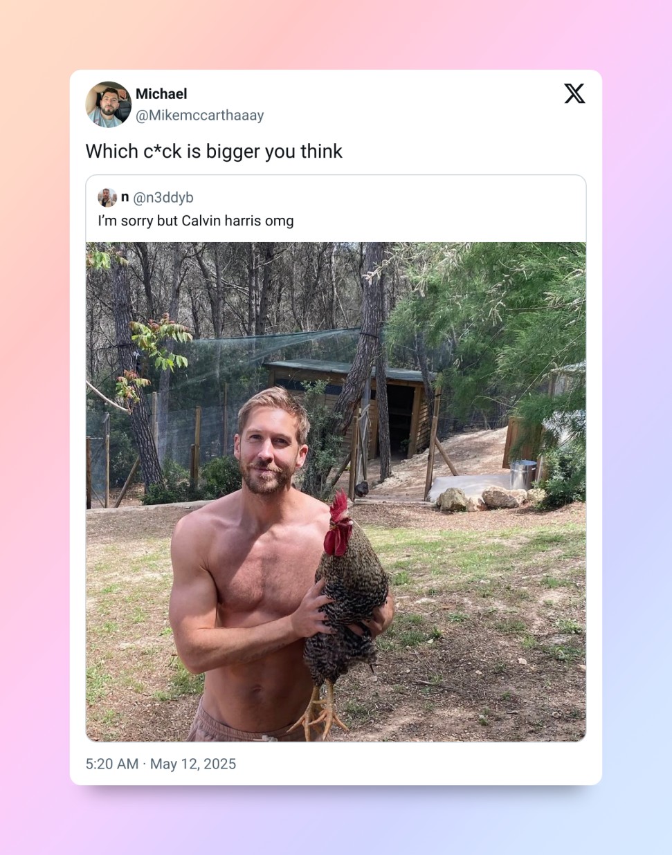 The 41-year-old Scottish dance icon took to Instagram over the weekend to announce the release of his latest single, “Blessings” featuring Clementine Douglas — but let’s be honest, the real blessing was the shirtless pic he posted alongside the news. Standing tall (all 6’5” of him) and smirking like he knew exactly what he was doing, Harris held a rather plump, feathery cock right at chest height. Subtle? Absolutely not. Effective? Let’s just say Instagram’s thirst index spiked immediately.