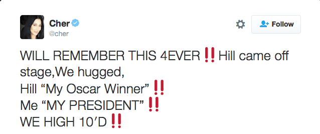 This is not the first time Cher has publicly supported the Democratic candidate for President. Here is phone video of Cher at Clinton Fundraiser, June 6th,2016