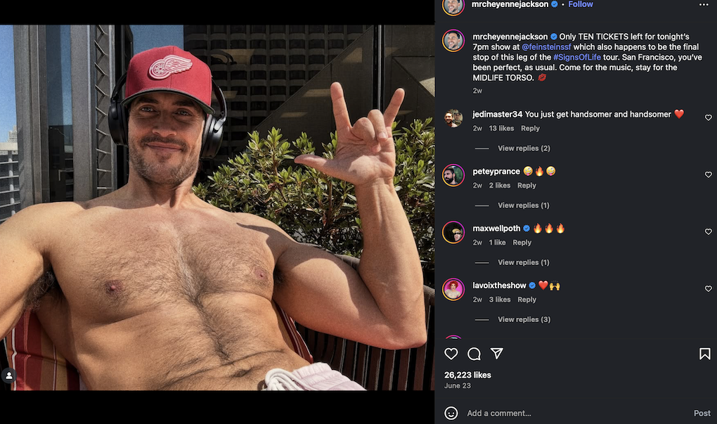 Captioned, “I’m just a boy, standing in front of an algorithm, asking you to buy tickets to my show in #FireIsland on JULY 26. #CherryGrove,” the Instagram thirst trap/promo shot did exactly what it was supposed to do: get everyone extremely online and extremely ready.