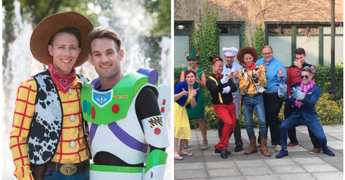 “Garrett wanted to dress as Buzz and Woody because ‘You’ve got a friend in me’ is one of his favorite Disney songs, and has known for a long time he wanted that to be the song he danced to as his first dance. So of course [I] had to be Sheriff Woody. Both characters are reminiscent of each of our personalities. About a year out from the wedding we started to get more serious about the wedding. That’s when we were like this is our special day we should do what we want and have the things that we like. We love Halloween and we throw an elaborate themed party every year. We also enjoy Disney-bounding in our everyday and cosplaying at comic cons and the renaissance faire. So it was a logical decision to combine all of these things for our wedding.” – Pink News
