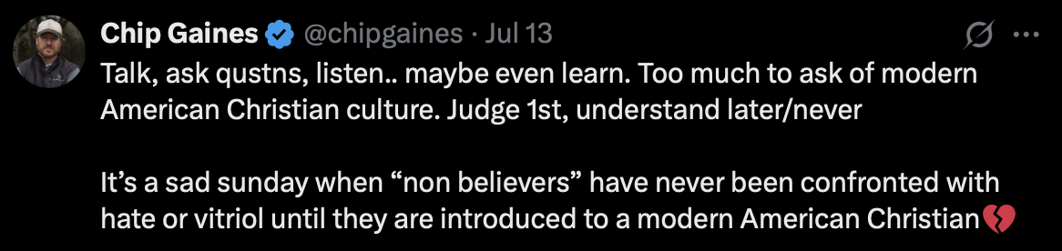 “It’s a sad Sunday when ‘non-believers’ have never been confronted with hate or vitriol until they are introduced to a modern American Christian,”