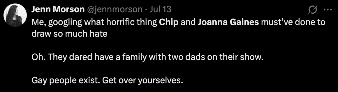 The show had been previously described by Magnolia Network as offering “family-friendly content,” and for many supporters of LGBTQ+ representation, this episode was a welcome sign of progress. Still, the backlash was swift. When Chip Gaines promoted the show via his social media on July 10, his post was flooded with thousands of angry comments, many criticizing the inclusion of a gay couple on a show they expected to reflect conservative values.