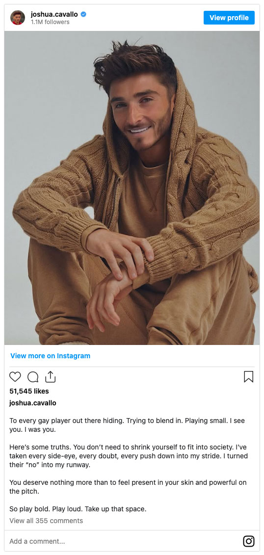 Out footballer Joshua Cavallo told his followers to “play bold, play loud.”