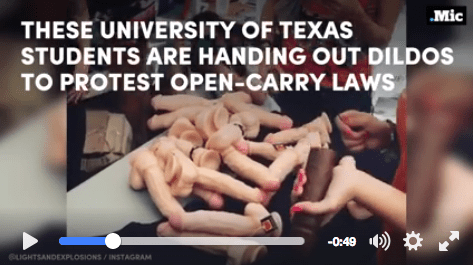 We recently highlighted what some members of the LGBT community are doing to work toward better gun legislation in Activism / Marches Grow In Number In Response To Orlando Tragedy.   We think we might like to take up someof the practices of these Austin, Texas college protesters. In an article in Mic.com titled "Texas Students Can Now Bring Guns To Class. 'Cocks Not Glocks' Is Bringing Dildos Instead".