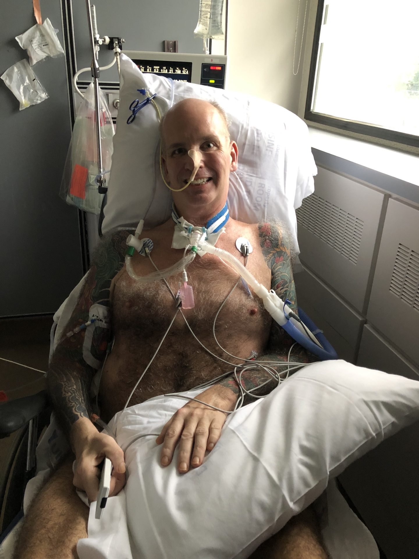 As of this morning, day 69 of his stay in the ICU, Greg is finally off the ventilator and was decannulated (tracheostomy removed). Within the next 24 hours he will likely be moved to a rehabilitation unit to work on physiotherapy and restrengthening. He went into the ICU at 6’6 and approximately 280-290 pounds (muscular, but with a bit of a belly) and he now weighs just over 200 pounds. He cannot yet sit up on his own, as he is quite weak, and he has developed a nerve condition in his neck shoulder that has severely weakened his left arm. Now that he is free of the ventilator, physiotherapy should be a lot easier and will be the big focus to get him out of the hospital.Â