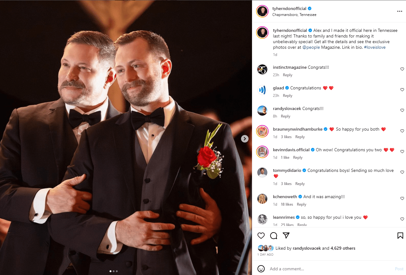 From all of us here at Instinct Magazine, I want to say congratulates to Ty and Alex. May they have many wonderful years together. Love is not a timeline. It can happen at any moment and we’re super happy these two men found each other at the right time! Not only is Ty a talented singer, but he’s one of our favorite personalities to cover at this publication.