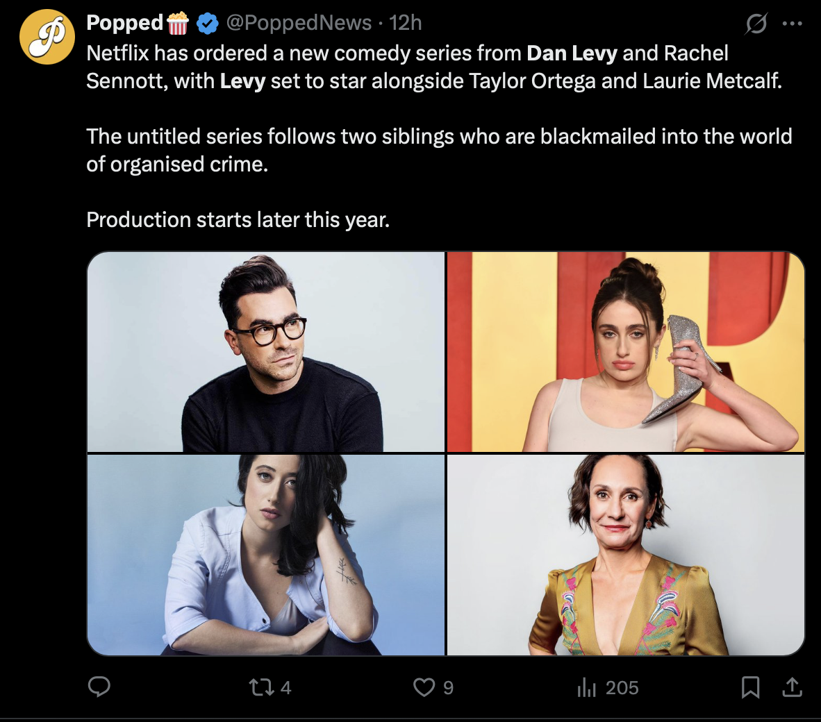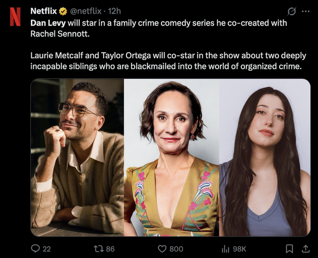 Starring alongside Levy is Taylor Ortega (The Four Seasons), who may be playing his equally “incapable” sibling—imagine a modern-day Moira and David if they were dropped into a mafia subplot—and the always-fantastic Laurie Metcalf (The Conners), whose comedic brilliance and dry wit will no doubt bring serious firepower to the series.