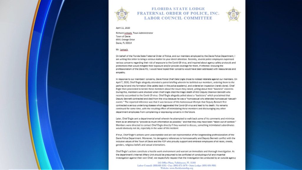 CBS reports that a complaint was filed and sent to Davie administrator Richard Lemack from the Florida State Lodge Fraternal Order of Police Labor Council Committee. The complaint alleges that Chief Engle berated several Davie officers who had expressed their concerns about the protection levels that officers are currently receiving from COVID-19 while on duty. “We had several that came forward and several who were afraid to come forward as well. That is our job at that point for our officers and the members we represent when they feel intimidated,” explained Fraternal Order of Police Chief of State Mike Tucker on April 7 (see full complaint letter below).