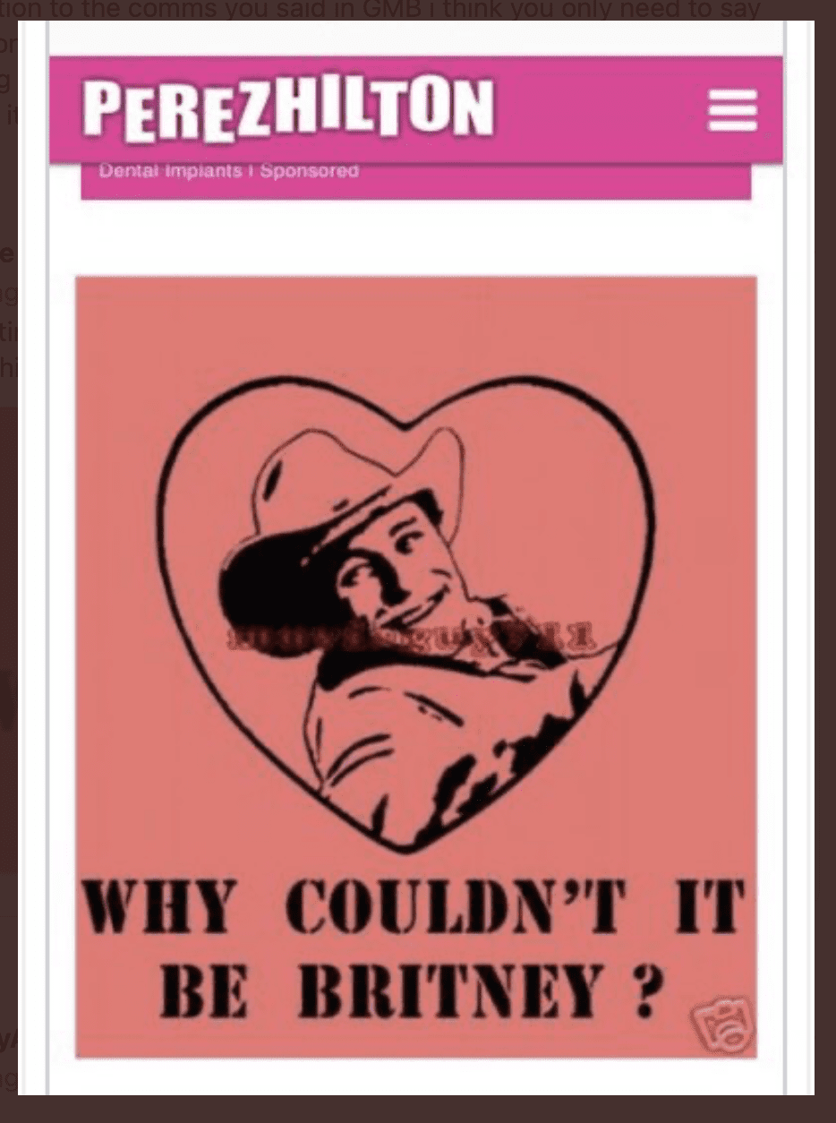 The less-than-convincing apology was apparently Perez’s way of making amends for all the years — and there were many— that he used his massive social media platform to bully Britney with unfathomable taunts. When I say ‘unfathomable,’ I’m not speaking in superlatives. For example, take this hideous graphic design Perez shared without shame after the untimely death of actor Heath Ledger: