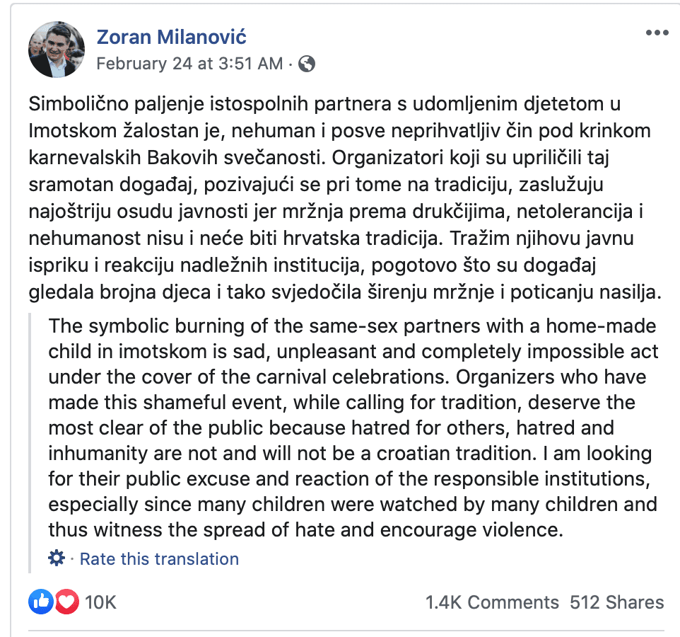 Zoran Milanović , Croatia’s President, admonished the act in a post on Facebook: