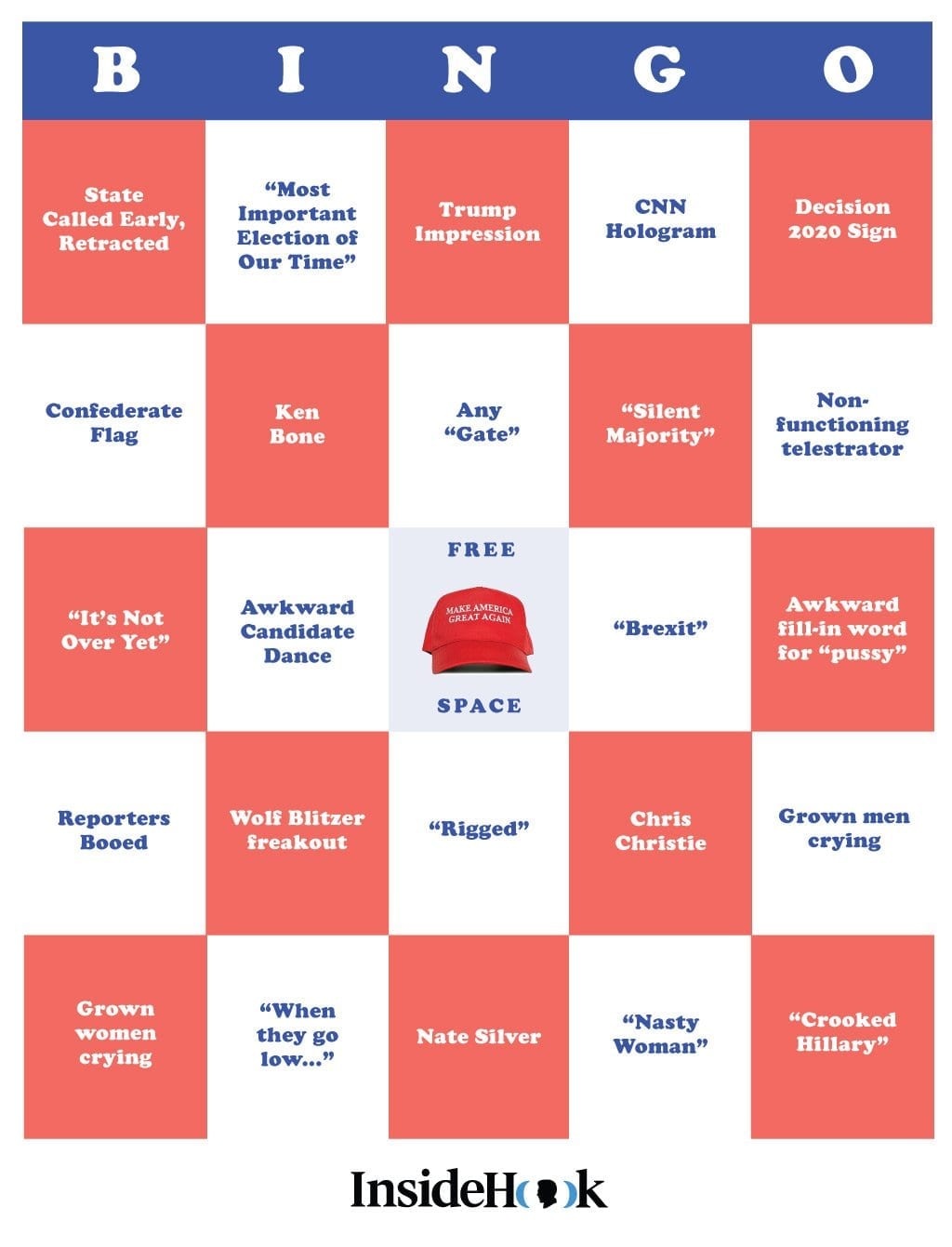 Are you all set for tonight's results? I've got the booze, the stress balls, and some porn incense to calm the mood in the room. But what I was missing was BINGO! Thanks to the peeps over at Insidehook.com, we're ready now.