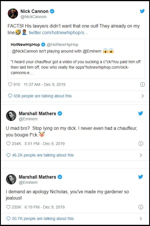 Cannon took to his Twitter account to announce Eminem’s lawyers have been contacting him since the song’s release containing the allegations. Does this make the allegations seem more factual? Eminem, who goes by his birth name Marshall Mathers on social media, retorted by saying Cannon is lying, he’s never had a chauffeur, and his gardener is now jealous.