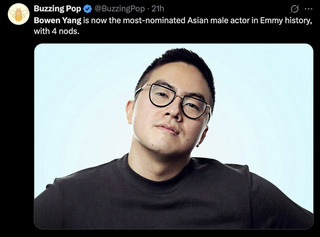 Next up, the effortlessly hilarious Bowen Yang, who continues to make Emmy history as the most-nominated Asian male performer ever. He just received his fourth nomination for Outstanding Supporting Actor in a Comedy Series for his work on Saturday Night Live. With his razor-sharp wit, iconic impressions, and ability to turn even the driest sketch into a queer masterpiece, Bowen is proving that representation doesn’t just matter—it shines.