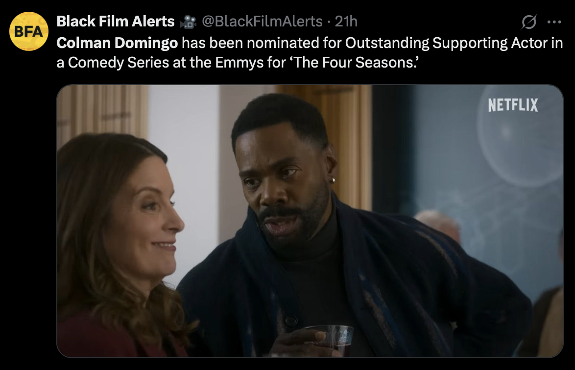 And how about the ever-dashing Colman Domingo? Fresh off his Oscar buzz, Colman scores an Emmy nod for Outstanding Supporting Actor in Four Seasons. Whether he’s delivering powerhouse performances on screen or making a red carpet look feel like poetry, he’s a national treasure—and this nomination just cements it.