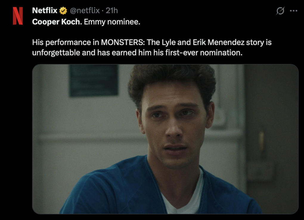 Rising star Cooper Koch also earns a well-deserved moment in the spotlight with a nod for Outstanding Lead Actor in a Limited or Anthology Series or Movie. The category may be stacked, but this breakout actor is standing tall—and queer—among TV’s biggest talents.