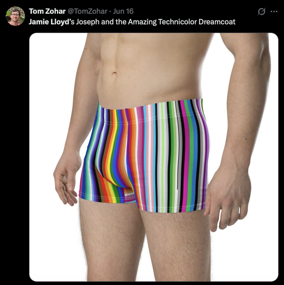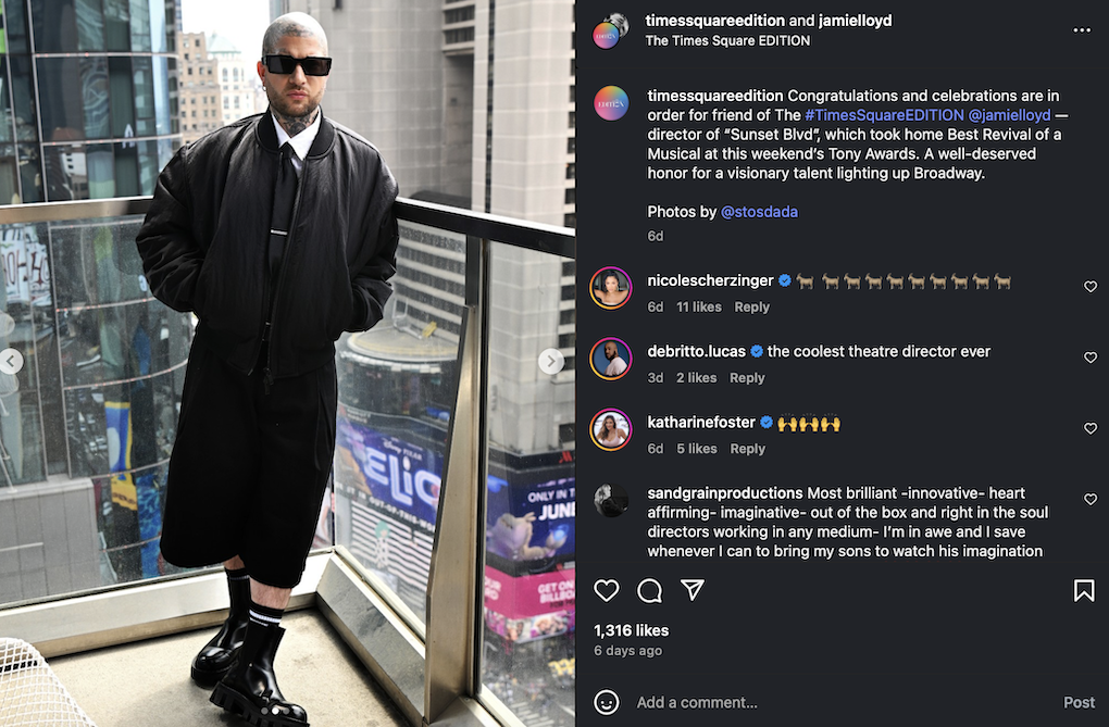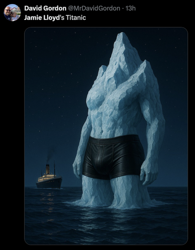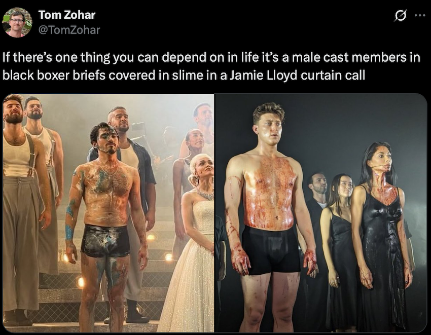 Whatever the reason, it’s fast becoming a signature move — one that Gay Twitter has clocked with the precision of a hawk in heat. “Jamie Lloyd must buy black boxer briefs in bulk,” one user quipped. Another declared, “He’s the Ryan Murphy of musical theatre — but sexier.” And honestly? They’re not wrong.